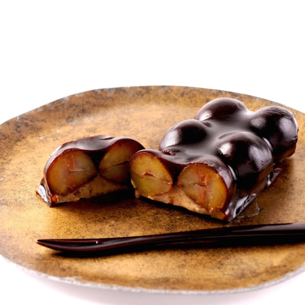 国産の栗餡に栗の渋皮煮を丸ごとのせ、黒糖羊羹で上掛けした「栗利久−雅−」。10粒の大栗をのせた見た目にも華やかな一品で、栗餡・栗の渋皮煮・黒糖羊羹の三層の断面が楽しめる、ご贈答にも喜ばれる御菓子です。